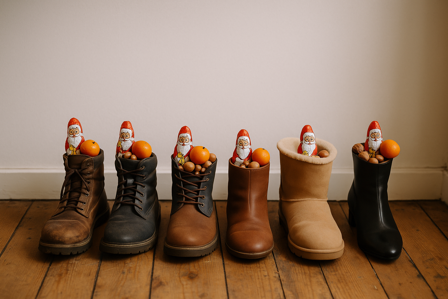 Die WG Bewohner entdecken im Flur ihre mit Schokolade, Nüssen und einer Mandarina gefüllten Stiefel.