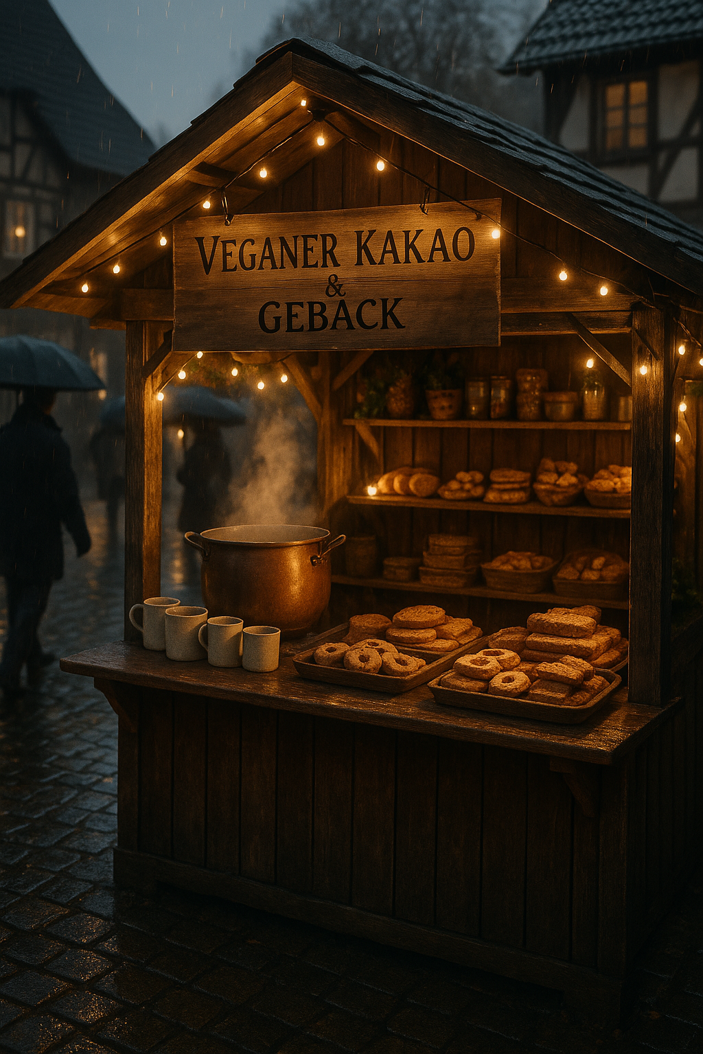 Dorothea steht an ihrem kleinen Holzstand. Über ihr hängen warme Lichter, vor ihr dampft der Topf mit veganem Kakao. Auf den Tabletts liegen ihre frisch gebackenen Kekse und Kuchen. Lächelnd wartet sie, bis jemand vorbeikommt, der ein warmes Getränk oder ein nettes Gespräch braucht.