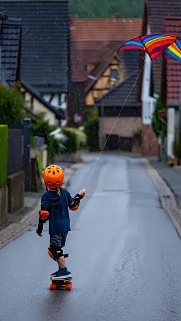 Kackwetter ist doof. Luis liegt gelangweilt zu Hause rum. Und gelangweilte Luise haben… Sseeehr dumme Ideen. Alsooo Skateboard vom JC ausgeliehen, immerhin schlau genug gewesen das Schutzzeugs dazu mitzunehmen (kann ja niemand behaupten er lerne nix ey… Nitm Traktorreifen den Hügel runter war ja hart dumm, da hätte Luis nen Helm anziehen müssen!), und nach ersten Versuchen nicht aufs Maul zu fliegen nen Drachen in den Wind steigen lassen. Zieht ordentlich das Ding. Sehr gut. Also ab aufs Skateboard damit. Und…