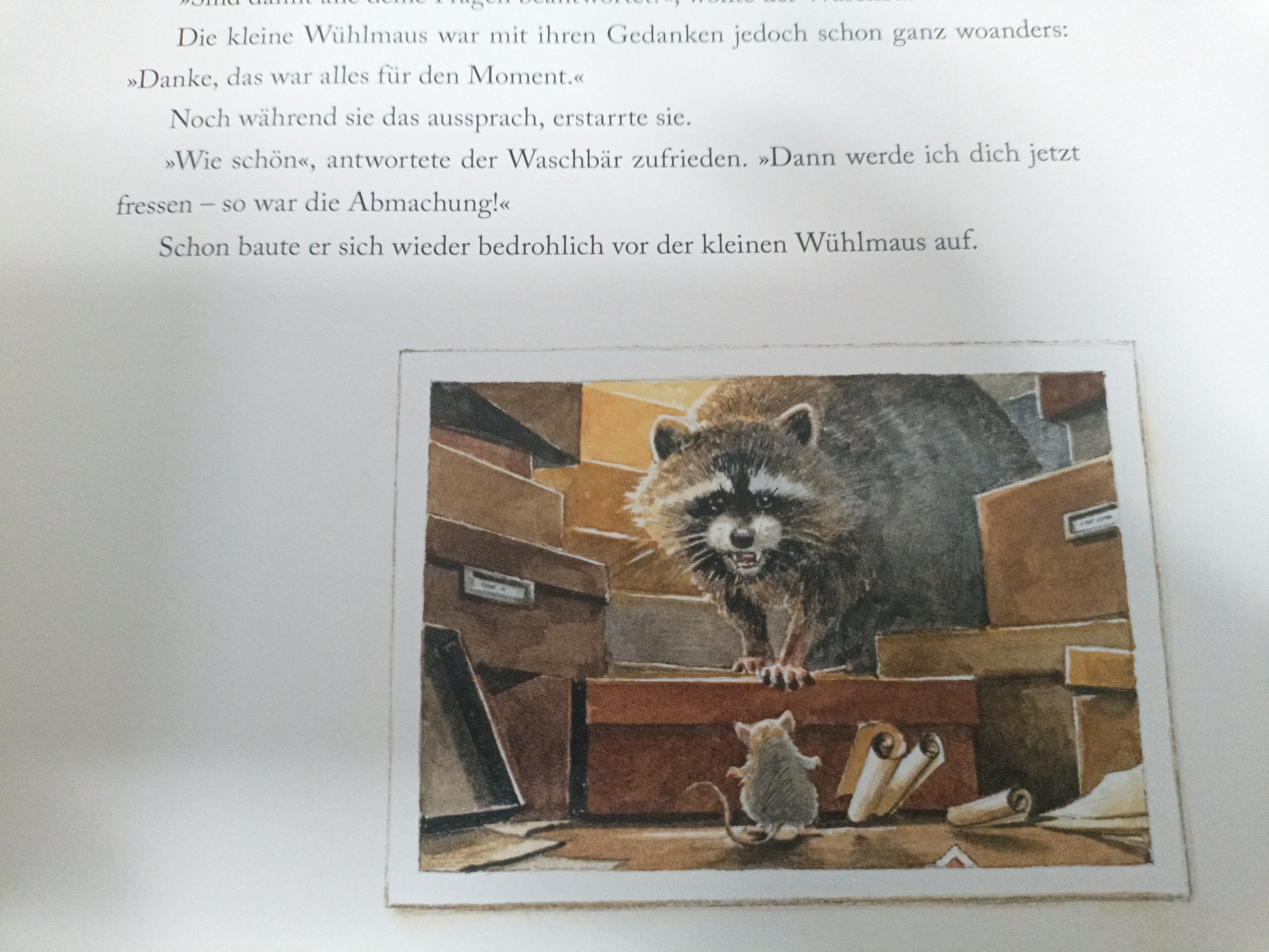 sideeye zu Franzi. Öh, ja, also hier ist er!! Stacy nimmt den kleinen Waschbären in seinen Decken gewickelt hoch und hält ihn Franzi hin. Freddy hat ihn… Waschlappen getauft…