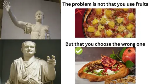 Explanation: Ancient Roman predecessors to modern pizza used pomegranate, amongst other fruits. Of course, such proto-‘pizzas’ lacked tomatoes (as tomatoes come from the Americas) and probably lacked mozzarella (as mozzarella is first mentioned during the Renaissance).