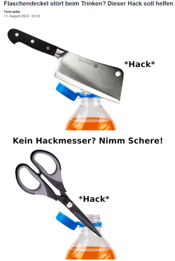 Darunter ein Bild einer Kunststoffflasche mit angebundenem Deckel und einem Hackmesser welches schlecht an der Plastikverbindung zwischen Deckel und Flasche reineditiert wurde. Daneben in Sternchen der Text “Hack”.
