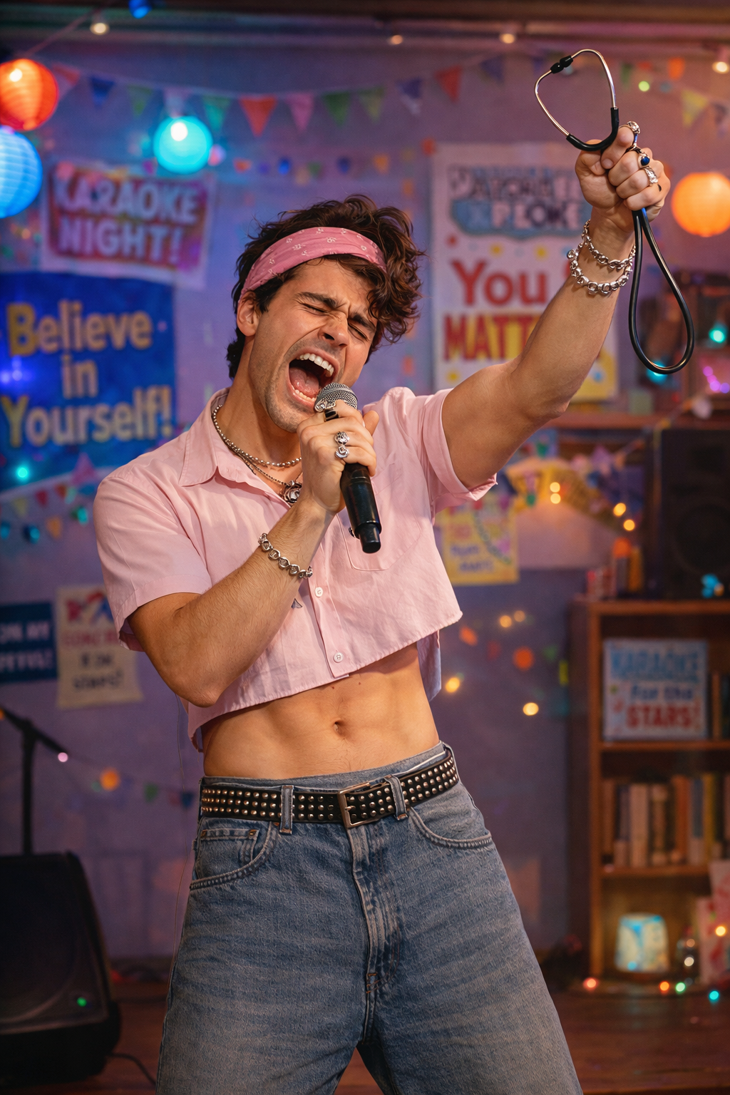 Dorothea hat den Jugendclub passend zum Karaokeabend geschmückt und einen großen Tisch für das Buffet aufgebaut. Ihre Snacks stehen bereits bereit, daneben ist noch genügend Platz für alles, was die Gäste mitbringen. Als sich die Räumlichkeiten langsam füllen und eine erwartungsvolle Stimmung entsteht, tritt sie auf die provisorische Bühne des Abends und stellt sich ans Mikrofon. Schön, dass ihr heute so zahlreich zu unserem Karaokeabend gekommen seid. Ich wünsche euch einen wunderbaren Abend voller Lachen, Freude, leckerer Snacks und Gemeinschaft. Dann setzt die Musik ein. Dorothea beginnt, “Nur ein Wort” von Wir sind Helden zu singen. Als das Lied endet, lächelt sie, verbeugt sich kurz und sagt: Danke, danke. Und jetzt gehört die Bühne euch. Ich freue mich darauf, euch performen zu sehen und wünsche euch ganz viel Spaß!
