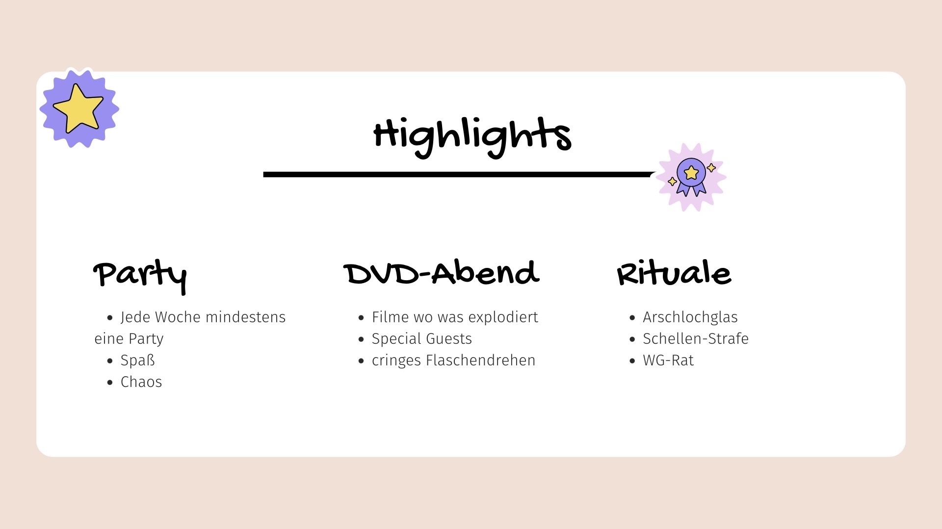 Also, jetzt sagt ihr fürs Team-Building auch gegenseitig etwas Nettes zueinander und erzählt eure liebsten WG-Momente miteinander.