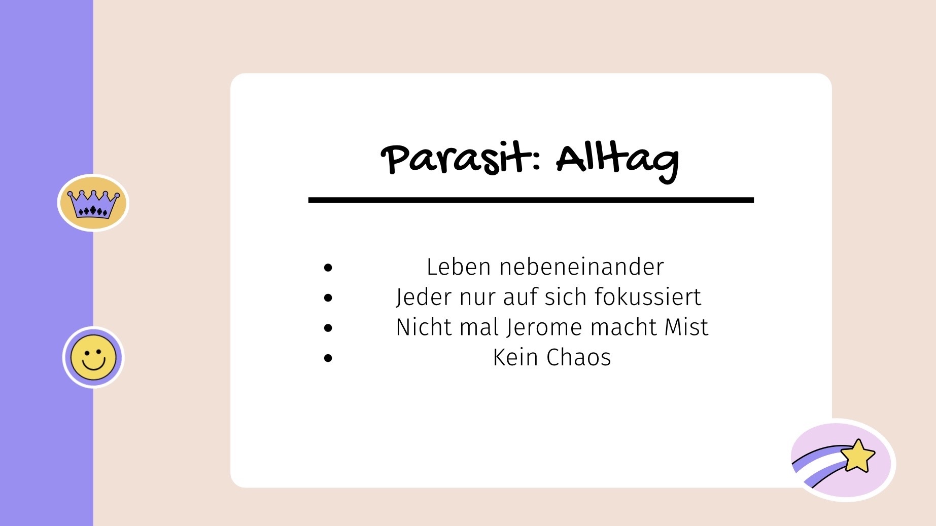 Um den Parasiten loszuwerden, habe ich mir einen nicen Masterplan überlegt! Also hört gut zu: Ich schlage vor, dass wir einen festen WG-Abend einführen, damit wir wieder mehr Quality Time haben. Dann können wir wieder DVDs gucken oder Spiele spielen oder so!