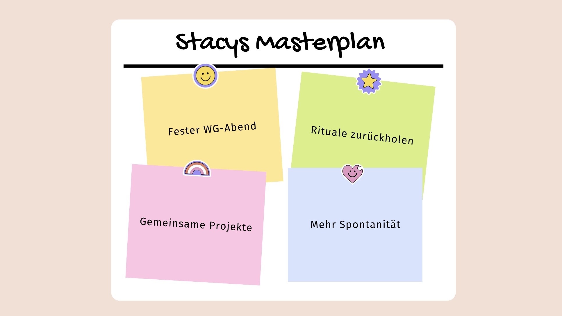 Stacy hat sich die Situation in der WG lange angeschaut. Sie hat es lange ausgehalten, ohne etwas zu sagen oder zu unternehmen. Und jetzt reicht es. Gestern Abend saß sie lange mit Vanja zusammen. Sie haben eine Präsentation vorbereitet. Stacy hat jedes Wort durchdacht, was sie sagen will und wie sie es sagen will.