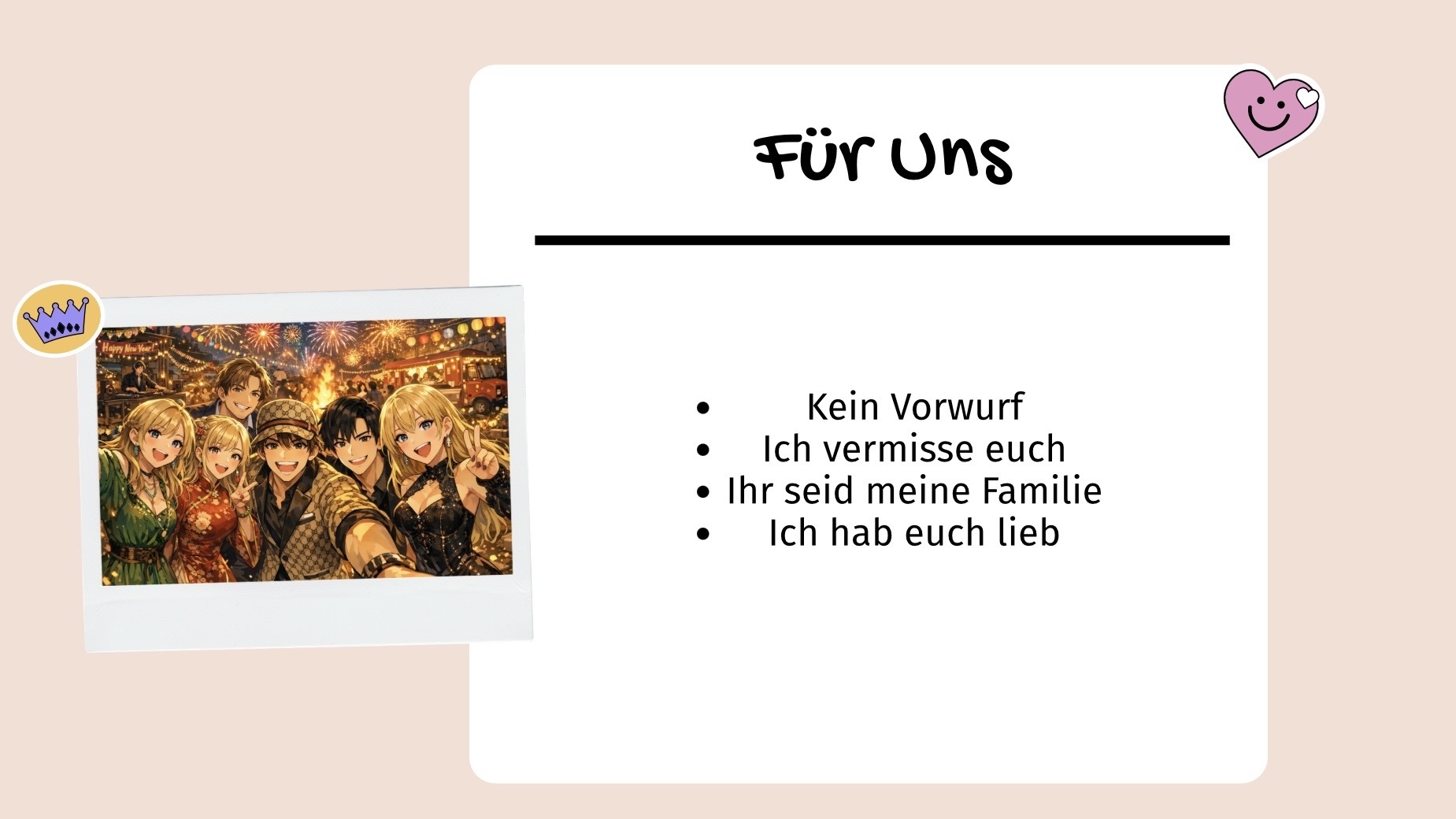 Also, das ist alles gar nicht gegen euch oder so. Aber ich vermisse euch einfach. Ihr seid meine Familie und ihr macht mich glücklich. Ich hab euch alle echt lieb. Und deswegen fände ich es schön, wenn wir wieder mehr Zeit miteinander verbringen könnten.