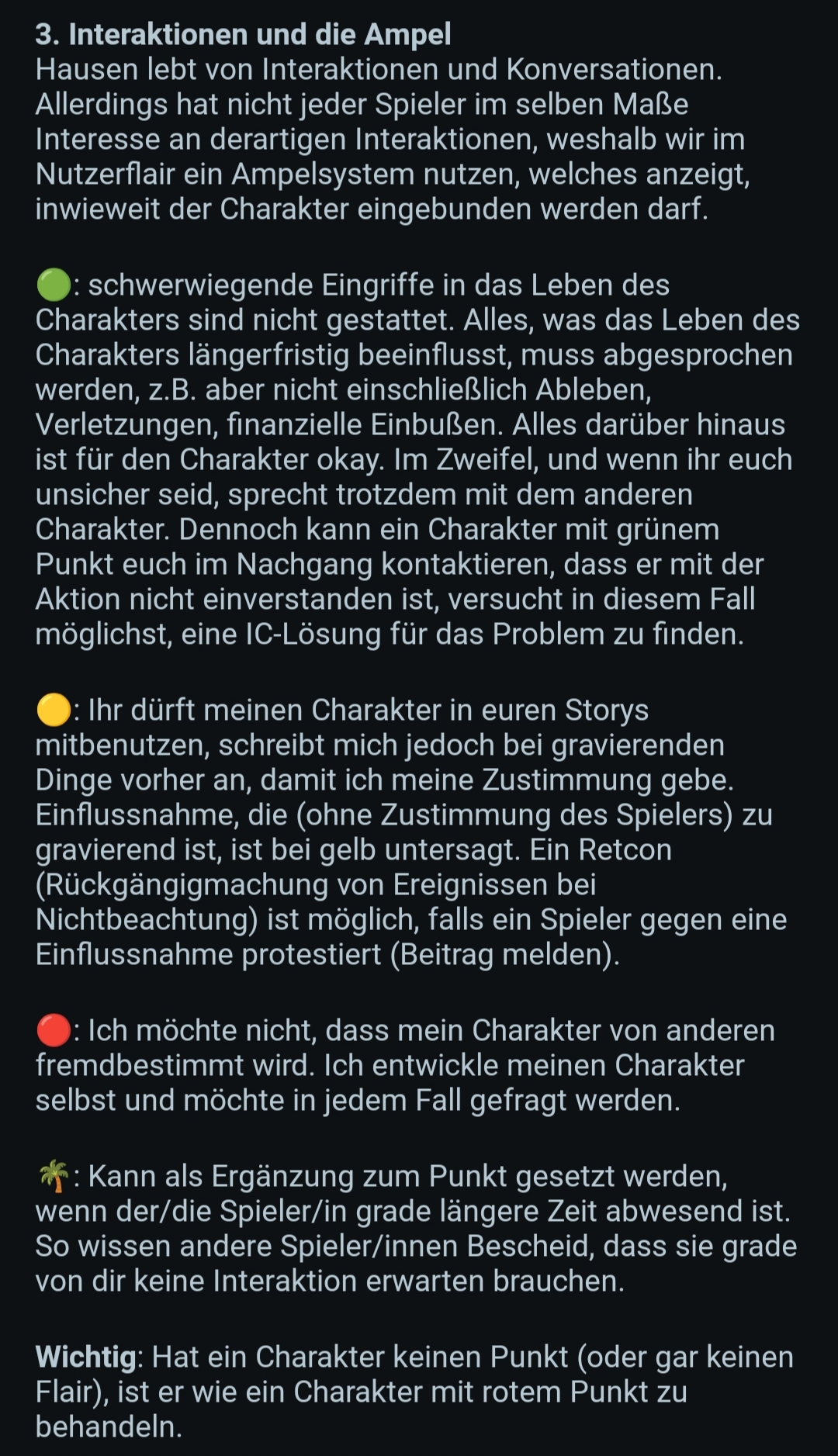 / un die Punkte sind Interaktionsrichtlinien, mit denen du angeben kannst, wie sehr andere deinen Charakter “mitgestalten/mitbewegen” dürfen. :) hab dir das mal hier angehängt.