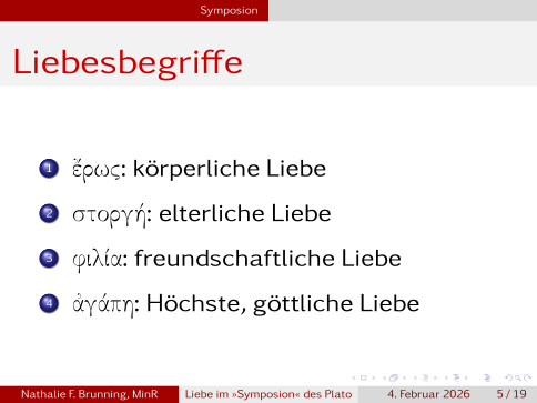 Bevor wir anfangen, müssen wir vier Wörter der alt-griechischen Sprache verstehen: Der ἔρως als körperliche Liebe; Der στοργή als elterliche Liebe; Die φιλία als Freundschaft; Und der ἀγάπη als höchste, göttliche Liebe.; Beachtet dabei, dass letzterer in der christlicehn Überlieferungstradition andere Bedeutungen hat, als in der Klassischen hier.