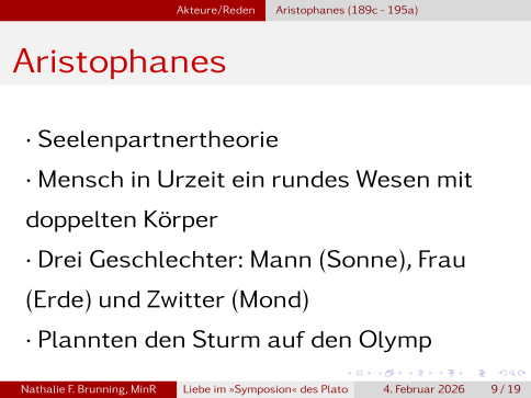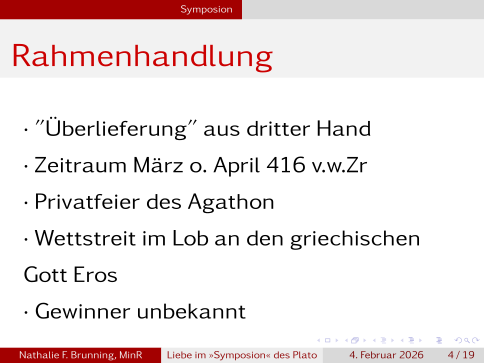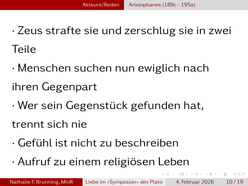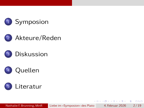 Wir werden uns zuerst mit der Einordung und den wichtigsten Begriffen beschäftigen, dann auf die einzelnen Redner innerhalb des Textes eingehen und dann in die offene Diskussion gehen. Nachfolgend gibt es dann natürlich noch die Quellen und das Literaturverzeichnis.