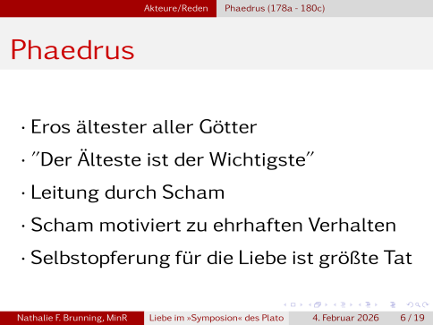 Kommen wir nun zu den Reden, Phaedrus als Erster lobt den Eros als ältesten aller Götter, und schließt daraus, dass er auch der wichtigste aller Götter sein muss. Liebe für ihn, löst Scham aus, Scham etwas falsch vor dem Objekt seiner Liebe zu machen. Zur Überwindung dieser benötigt der Mensch ehrhaftes, heroisches Verhalten bis zur Selbstopferung um so seinem Liebsten zu gefallen.