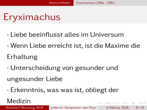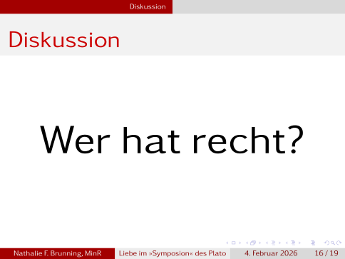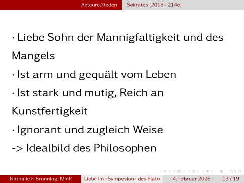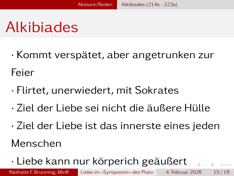 Zum Ende kommt noch der verspätete Alkibiades zu Wort, der leider bei einer vorherigen Feier zu viel getrunken hat, den kennt ihr aber?, Kein Kind meldet sich, also Alkibiades war … Nathalies einer Lehrer hat ihn damals als griechischen Rommel bezeichnet, das war schon damals nicht mehr zeitgemäß und griechischer Röhm des Andere wird es schon gar nicht sein, … ist nicht so wichtig. Also Alkibiades gesteht betrunken Sokrates seine Liebe, dieser erwiedert ihm diese aber nicht. Alkibiades begründet seine Liebe nun, in dem er sagt, es gehe ihm nicht um Sokrates hässlichen, alten Körper, sondern um sein goldes Inneres, was er auch als Gesetzmäßigkeit ausmacht. Sein Fehler und Grund von Sokrates Zurückweisung, ist nun dass er alleine die Körperlichkeit als Ausdrucksmittel von Liebe sieht.