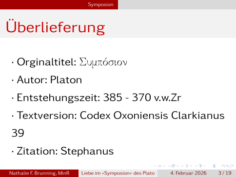 Fangen wir mit der Überlieferungstradition an, der Orginaltitel ist: Συμπόσιον ; Autor ist gemäß der kritischen Forschung Real-Platon, Irgendein Kind hebt die Hand, Jetzt bitte keine Fragen, die Möglichkeit besteht dann bei der Diskusion. ― Entstehungszeitraum ist frühstens 385 und spätestens 370 vor der westlichen Zeitrechnung, als Textversion halten wir uns an den Codex Oxoniensis Clarkianus 39, es wird nach der üblichen Stephanus zitiert.