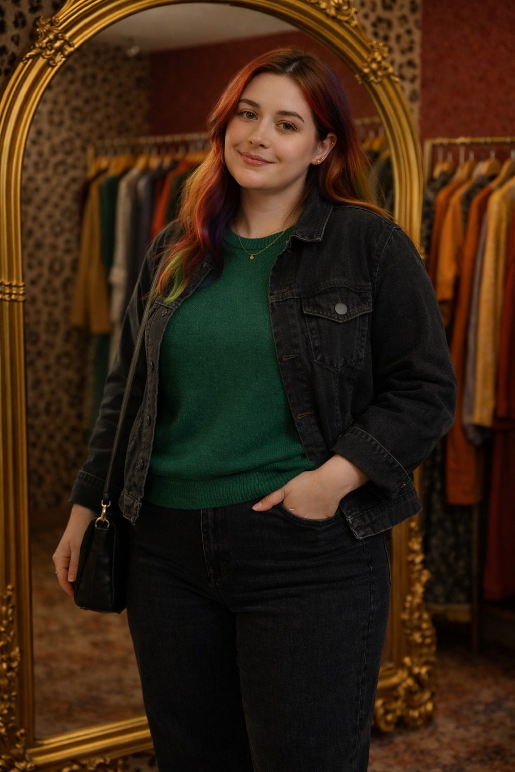 Stacy sieht Anni lächelnd an. Du siehst mega aus!! Ich weiß du bist nicht so der Handtaschen-Typ, aber die Taschen die das Outfit zu bieten hat, sind halt nicht gerade groß. Stacy zieht den Vorhang vor dem großen Spiegel im Saal weg. Und?!