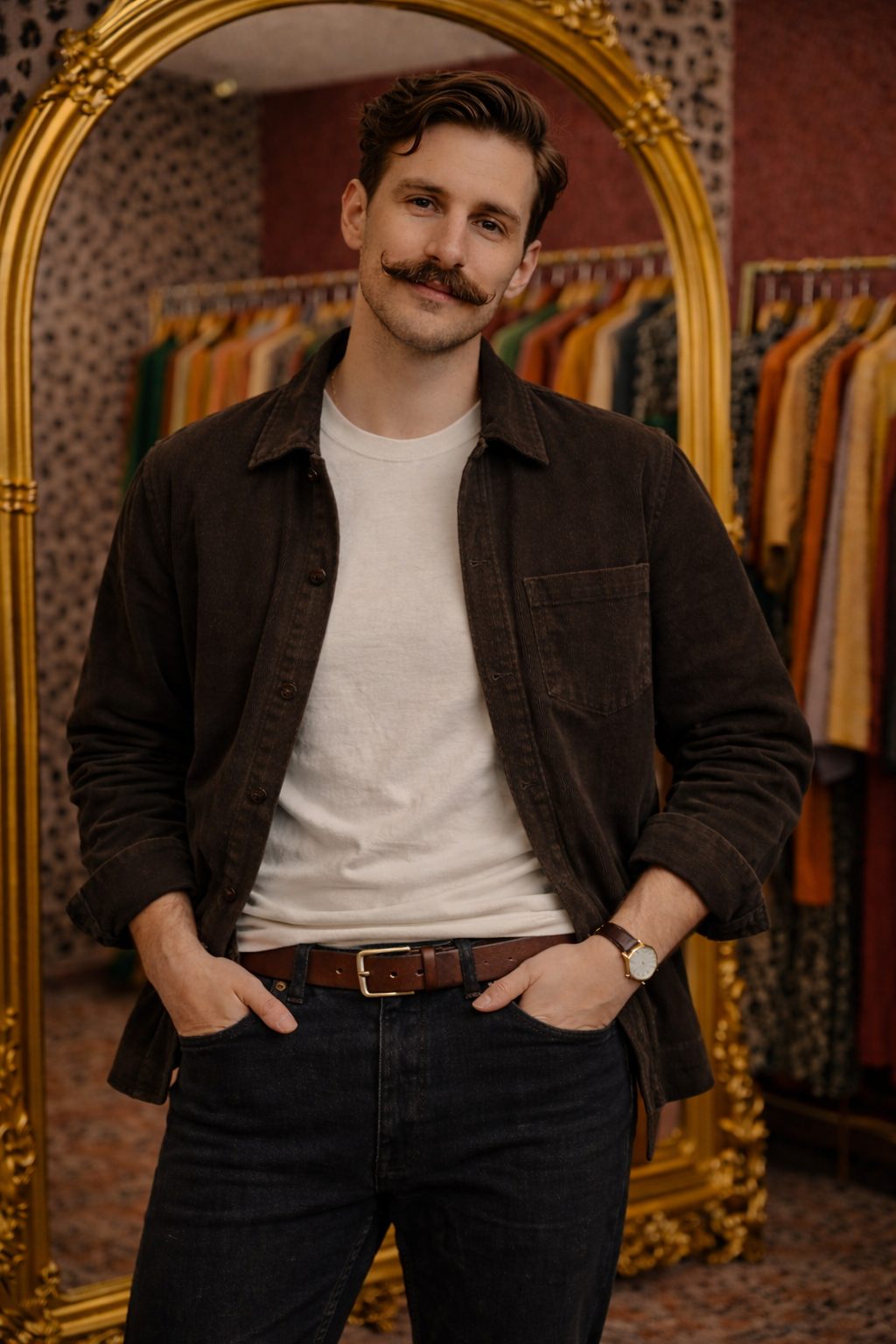 Franzi, seh dich doch einmal um, vielleicht hast du dann schon Inspiration. Franzi geht genervt in die Ecke mit den Männersachen. ^Ich will eigentlich nur, dass Franzi mal nicht die selben drei Jogginghosen mit ausgewaschenen Shirts zu Hause trägt ― und ich, eigentlich habe ich genügend Home-Office und Date-Sachen, aber …^ wie wäre “entspanntes Wochenende”, zwei Outfits, die man tragen kann, egal ob man noch kurz eine Telko mit der Arbeit machen muss, einen Braten drei Stunden lang vorbereitet, die Hecke im Garten schneidet oder nach einer Lerngruppe eine Doku auf der Couch sieht ― aber du darfst mich gerne überraschen ^, solange ich mir nicht die Haare schneiden muss, bin ich bei meinem Aussehen recht indifferent.^