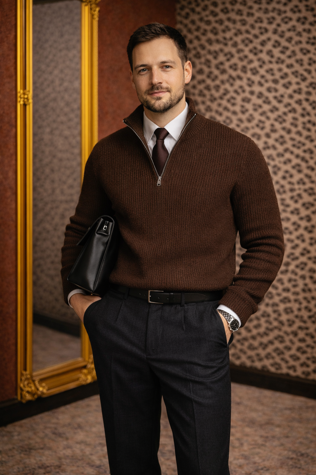 Stacy? Maximilian begutachtet sich im Spiegel warum trage ich eine Handtasche und weshalb soll ich bei einem Frühstück im Dorfcafé eine Krawatte tragen? Er schaut sich selbst skeptisch von oben bis unten an ist das nicht overdressed?
