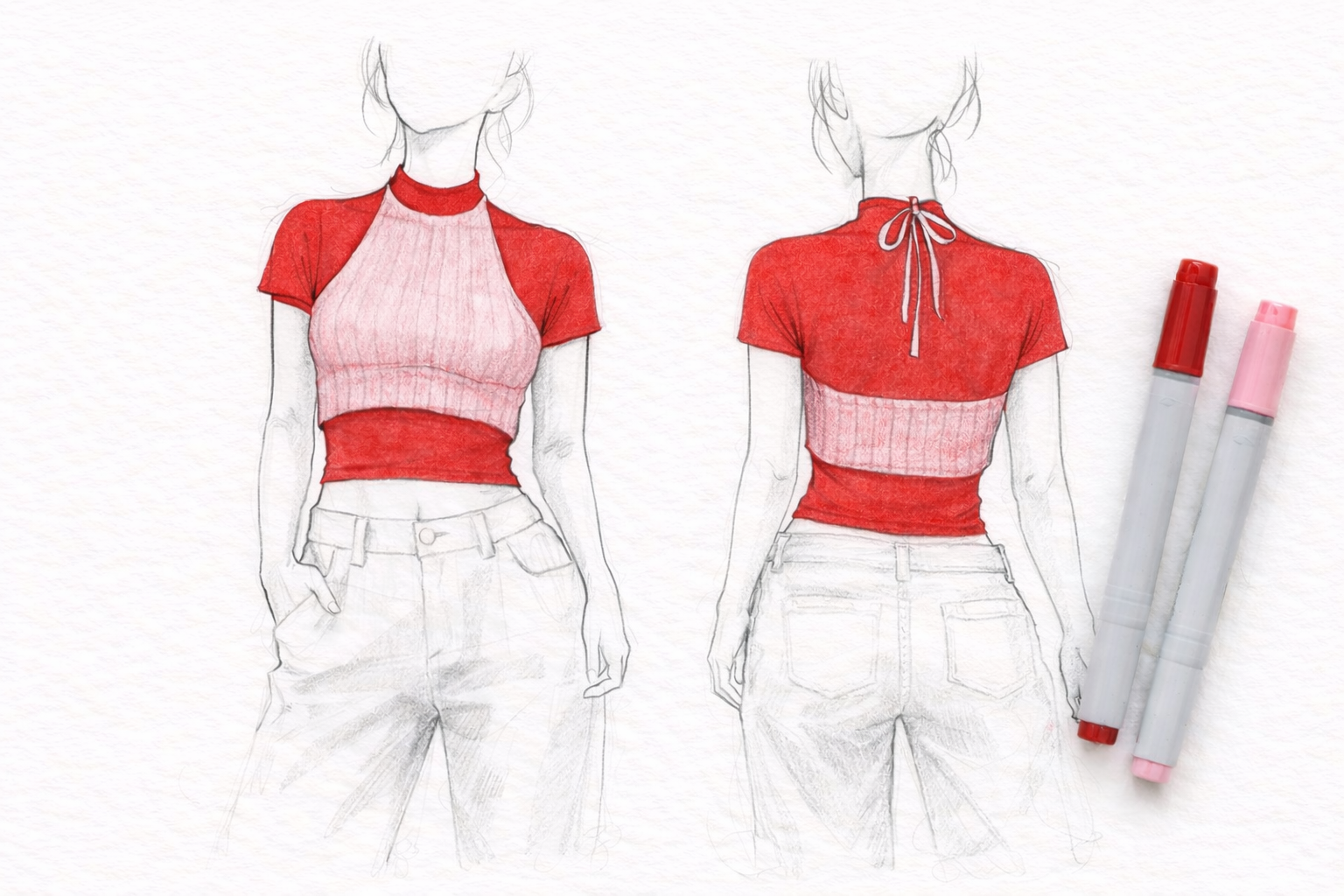 Nach gut zwanzig Minuten legt Stacy den Bleistift an die Seite. Ihr Blick wandert über die Linien, prüfend, als würde sie nicht nur sehen wollen, wie es aussieht, sondern ob es sich richtig anfühlt. Dann lässt sie den Bleistift sinken, greift wortlos nach ihrer Handtasche und zieht den Reißverschluss auf. Zwischen Lippenstift, Schlüssel und teurem Parfüm findet sie, was sie sucht. Das Etui mit den Stiften. Sie sucht sich den rosa und den roten Stift heraus und malt etwas aus. Dann schiebt sie das Blatt zu Maikki rüber. Also… eigentlich müsste ich jetzt noch hinschreiben, welches Material das ist und so. Aber ich finde, man sieht das auch so. Das Shirt wäre Stretch. Und der Pullunder ein dichterer Strick, damit er nicht einfach… nachgibt. Sie zeigt auf die Hose. Und das hier Leinen. Oder ein Leinenmix. Sie zuckt mit den Schultern. Außerdem macht Zeichnen mehr Spaß als Schreiben.