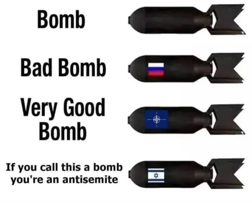 But this is literally how western media and leaders are portraying this. All bombs are bad, NATO or Russia or China or Iran or Israel I don’t care. And fuck Israeli bombs in particular where and why would bombs by a colonial entity committing genocide ever be necessary wtf?