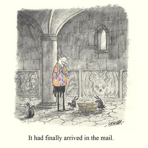 Alt Text: A cartoon illustration of a happy vampire trying on a shirt he just ordered online. Print available at gricklemart.com