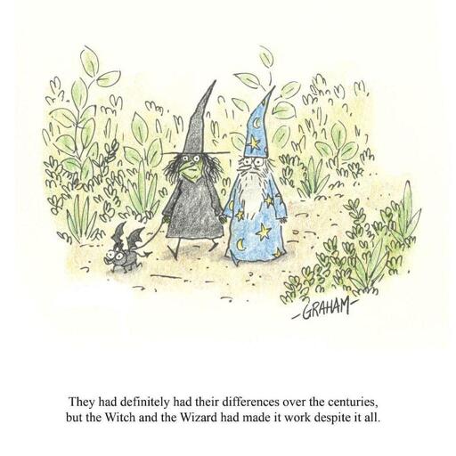 Alt Text: A cartoon illustration of a witch and wizard walking holding hands with their pet bat creature. Caption reads “They had definitely had their differences over the centuries but the Witch and Wizard had made it work despite it all.”