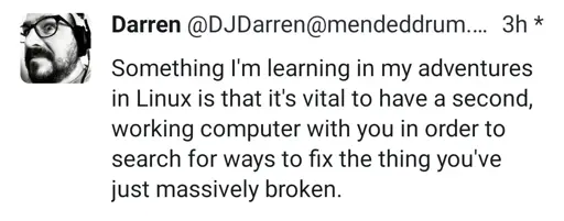 If I had a nickel for every time my phone saved me from massive failures in Linux, I’d have 4 nickels. "<.<