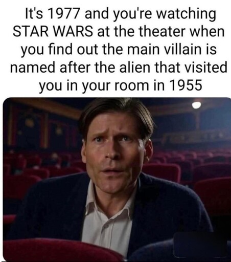 In Back to the Future, Marty uses his father’s love of sci-fi books to scare him by pretending to be an alien called Darth Vader from the planet Vulcan. This meme shows the realisation later when the father watches Star Wars (the father is played by Crispin Glover)