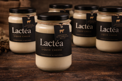 Der eigentliche Mittelpunkt jedoch liegt etwas versetzt, weder im Zentrum der Menge noch verborgen, sondern so positioniert, dass er sich der Aufmerksamkeit nicht entzieht. Ein einzelner, dunkler Tisch. Darauf stehen mehrere identische Gläser, gefüllt mit Lactéa. Der Käse ruht darin schwer und glänzend, seine Oberfläche glatt, beinahe makellos. Kein Überangebot, keine Variation - nur dieses eine Produkt, konsequent in Szene gesetzt.