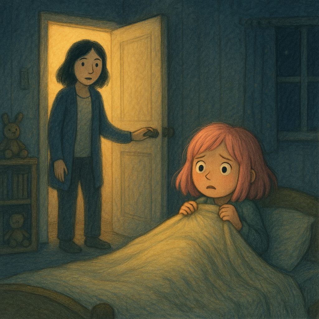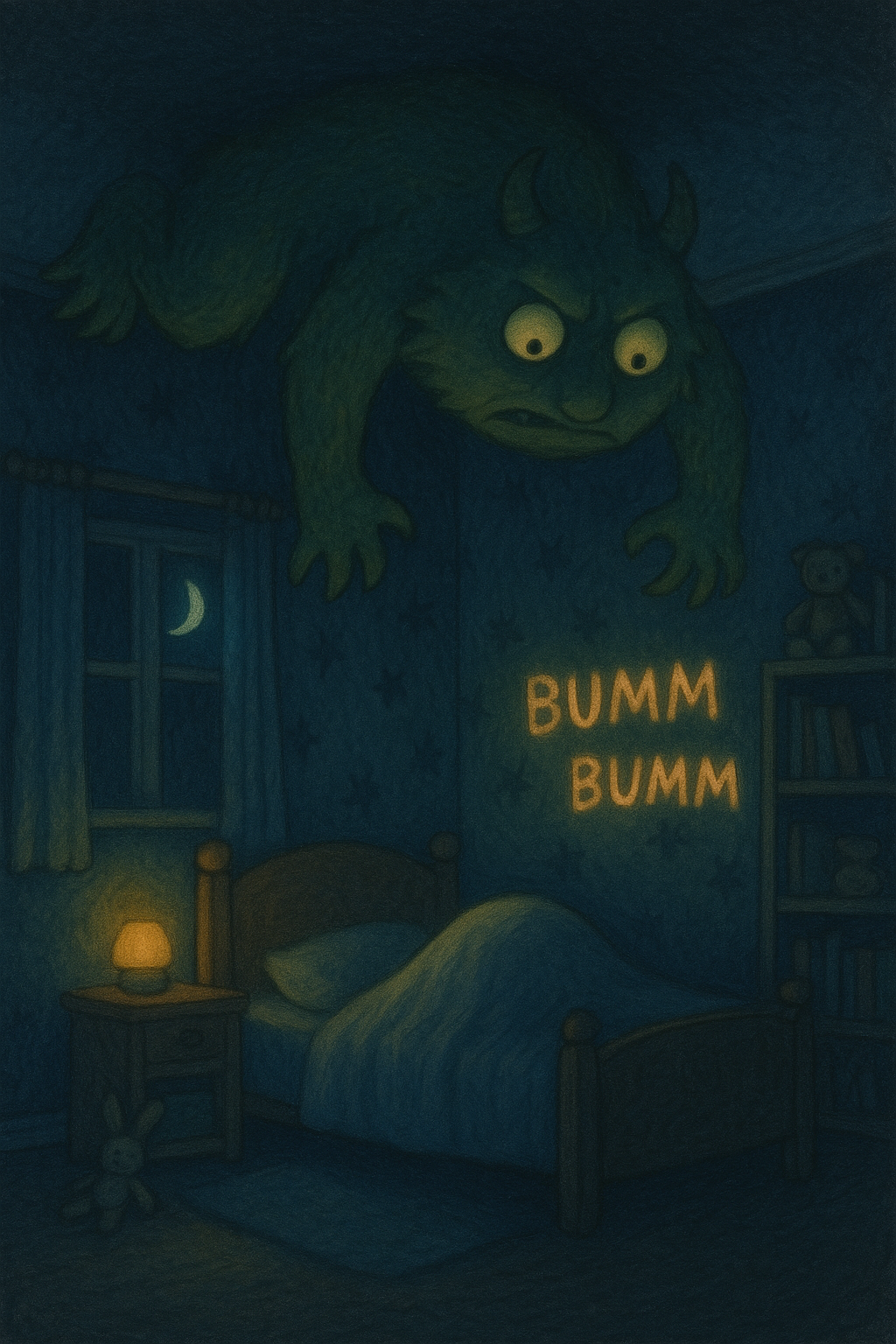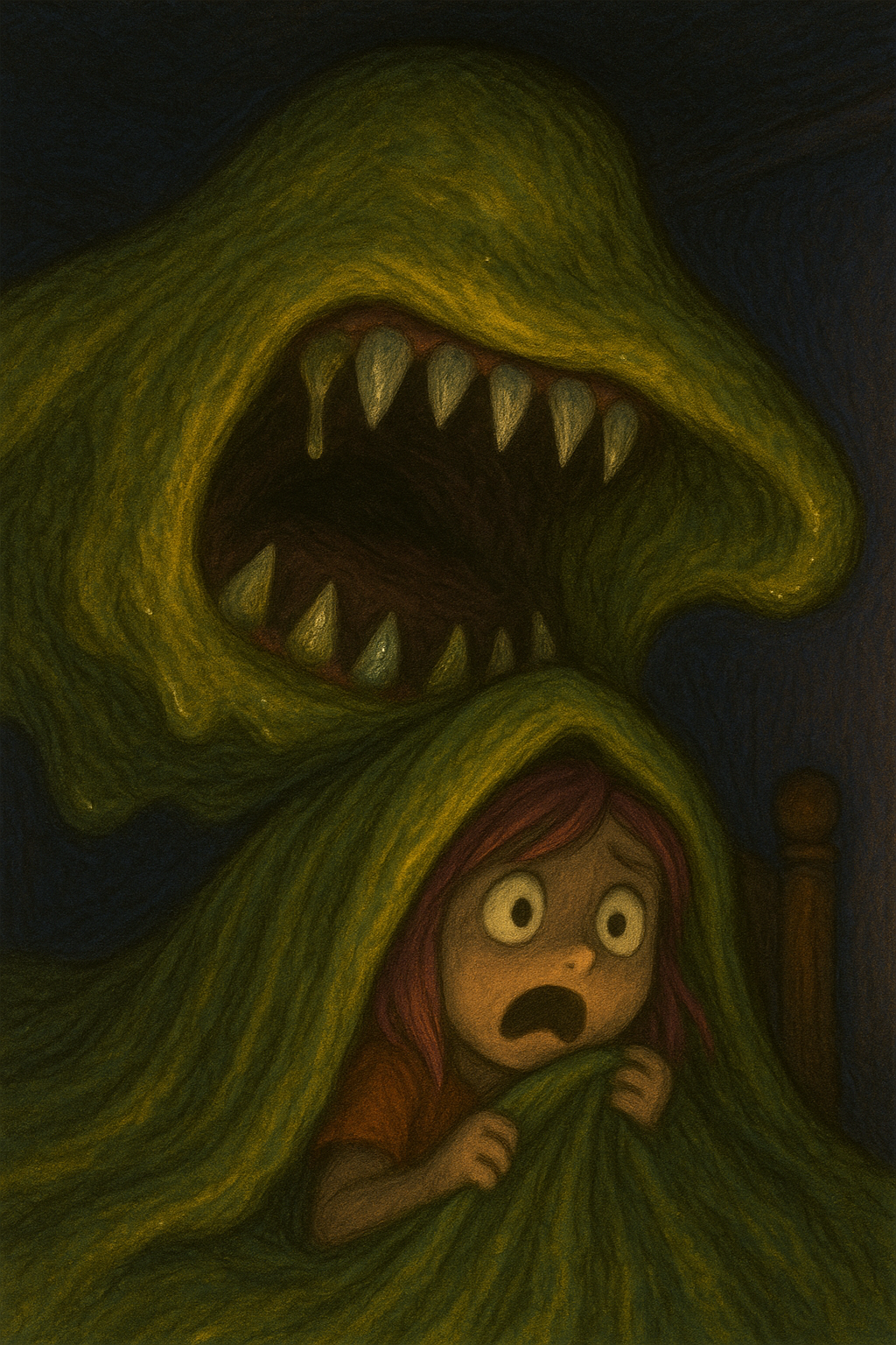 Und dann, bin ich doch neugierig. Nur ein kleines Stück Decke hochheben. Nur kurz gucken, ob er weg ist. Aber… Banjo ist nicht weg. Banjo ist die Decke. Die, die mich eigentlich beschützen soll. Und plötzlich fühlt sie sich anders an. Kälter. Glitschiger. Dann bewegt sie sich. Und da ist ein Mund. Ein riesiger Mund! Mit spitzen Zähnen, die glitzern wie nasse Steine. Und ich will schreien, ganz laut, aber meine Stimme ist einfach weg. Wie wenn jemand den Ton ausschaltet.