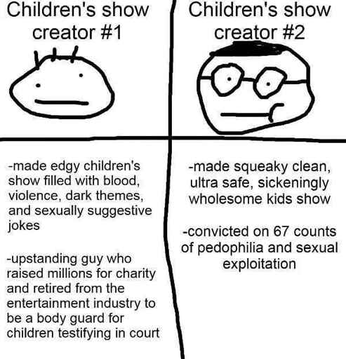 I’m guessing that guy from that swords cartoon on Cartoon network that got caught with CP vs. say, the creator of Samurai Jack (even though it’s simulated blood/ “oil”)