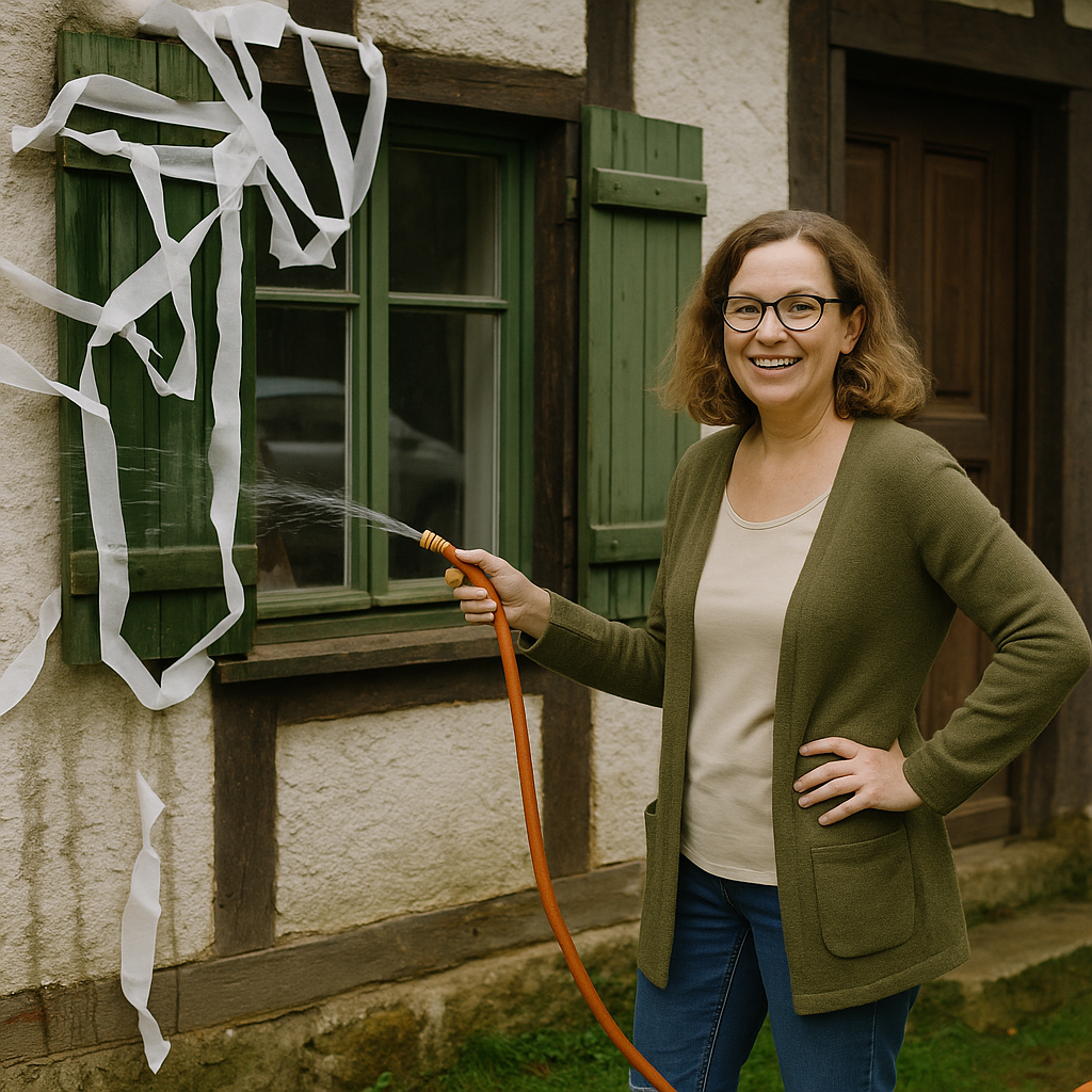 Dorothea steht neben Luis, die Arme verschränkt, ein Taschentuch in der Hand: irgendwo zwischen Kopfschütteln und unterdrücktem Lachen. Na also… du hast’s tatsächlich geschafft. Ich sag ja immer: Es gibt viele Wege, ein Ziel zu erreichen, manche sind halt… etwas ungewöhnlicher. Dann nimmt sie ihm vorsichtig den Schlauch ab, bevor er noch auf dumme Ideen kommt. Aber, Luis, versprich mir eins: Diese Methode ist in Ordnung. Wirklich an Hauswände pinkeln, aber nicht. Bitte mach das nie wieder.