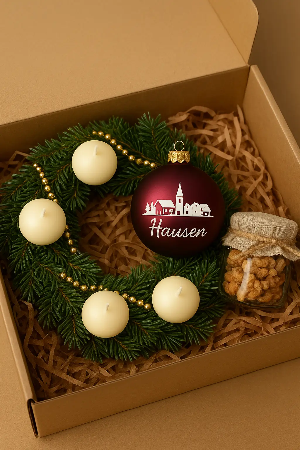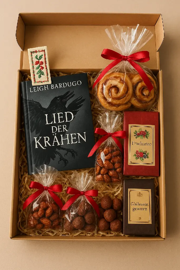 Spätabends. Es klingelt. Julian steht da mit einem Karton, der aussieht wie Weihnachten persönlich. Ein Kranz, eine rote Kugel mit Hausen, ein Glas Haselnusskonfekt. Alles zu schön, um ehrlich zu sein.