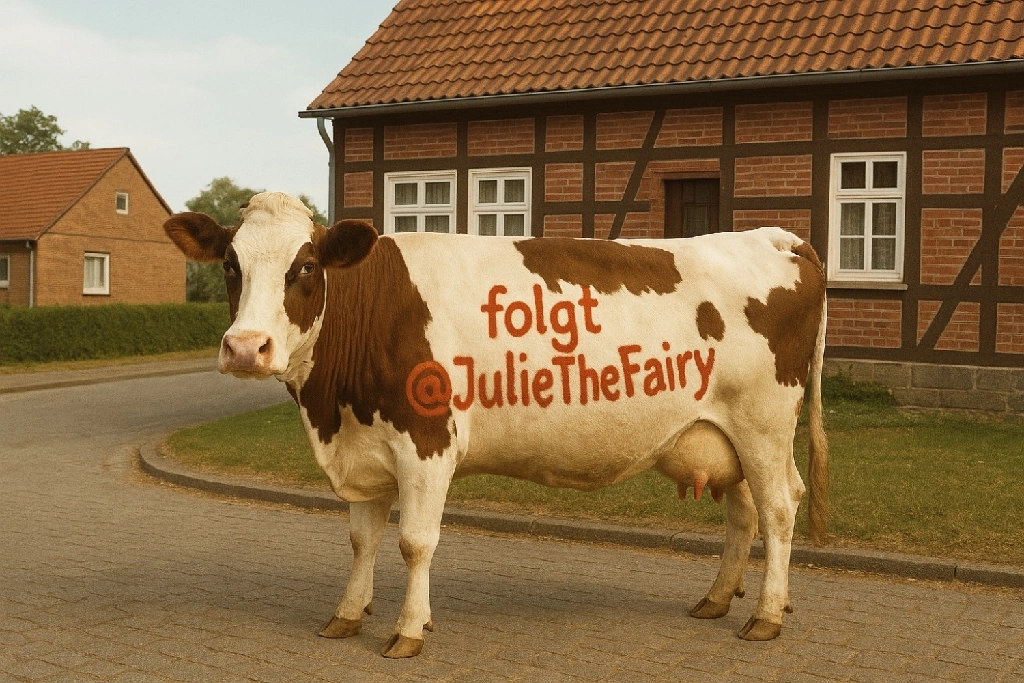 Ich traute meinen Augen nicht, Chef. Mitten auf der Dorfstraße steht eine Kuh, keine gewöhnliche, nein. Eine Kuh, die Werbung macht. Rot beschriftet, mitten auf der Flanke: folgt @JulieTheFairy.