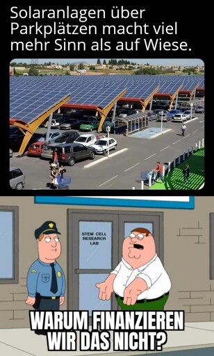 Ich stimme aber vollkommen zu: Parkplätze sollten so beschattet werden. Mein AG macht das schon so und gibt uns E-Auto-Fahrern den Strom günstig ab. Ein Supermarkt in der Nähe hat das auch schon gemacht. Ist halt super, wenn du nach dem Einkauf nicht in ein aufgeheiztes Auto steigen musst.