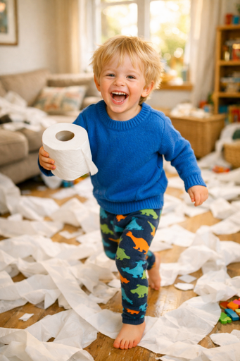 Nudels mit Tomatensoße?? Fiete quiekt fröhlich, als er Benni fertig mit Klopapier umwickelt hat.
