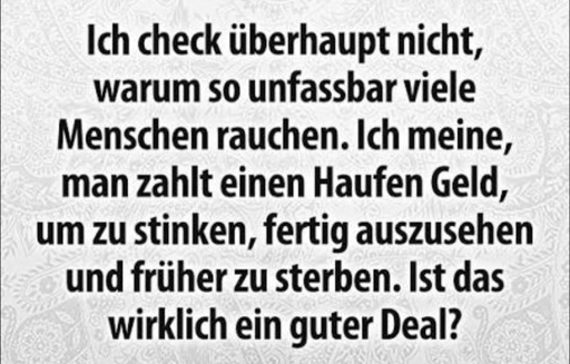 Als Schorsch gestern schon den dritten scheißarsch drecks Mental-Health-Walk gemacht und 23 Lakritzbonbons krachend und wirklich füllungsgefährdend gefressen hatte, war ihm klar: Er ist über’n Berg. Er KANN nur eine rauchen. Und dann wieder aufhören. Beruhigt von dem Gedanken hatte er Nenna vor die Glotze gesetzt und war zu Emils Laden gestiefelt. Freudig über seinen Erfolg, aufgehört zu haben, hatte er sich schon vorgestellt, wie das leckere Flüppchen sich anfühlen wird. Gerade, als er in seinem Tagtraum beim Ausdrücken angekommen war, stand er vor dem Laden. Die Tür war zu. Was ein Glück.