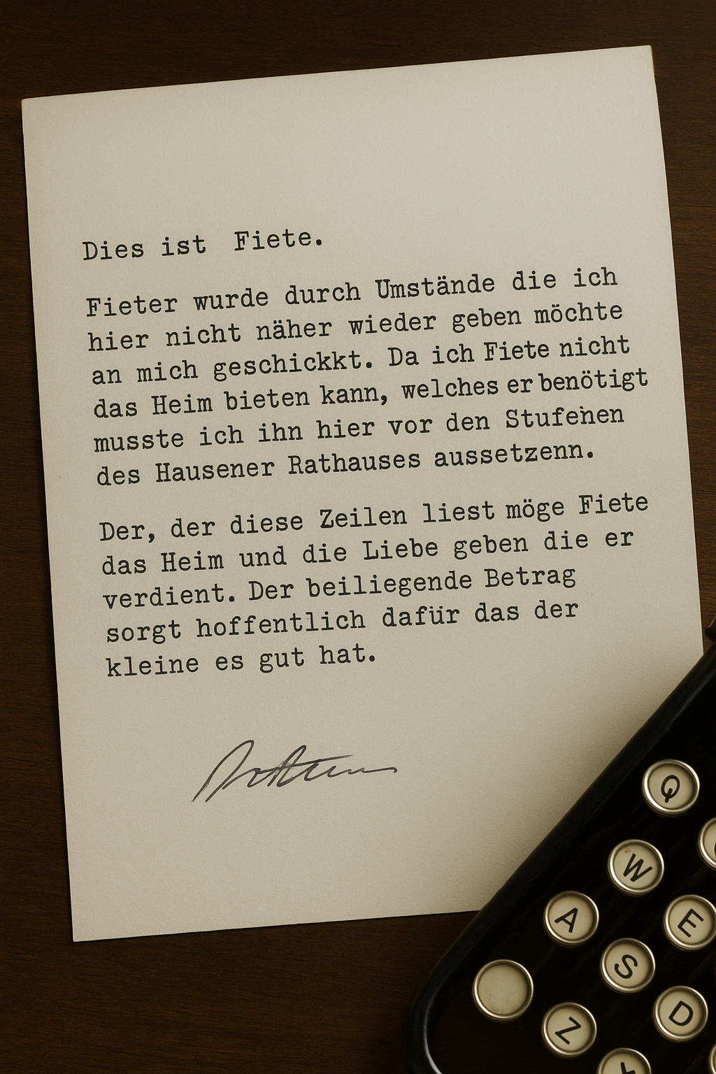 Eine dunkel gekleidet Gestalt läuft die Straße lang. Als die Gestalt das Kind sieht schaut sie es lange an. Dann nimmt sie Fiete auf den Arm, drückt noch schnell die Zigarette aus und verschwindet dann samt Fiete im Nebel der Nacht