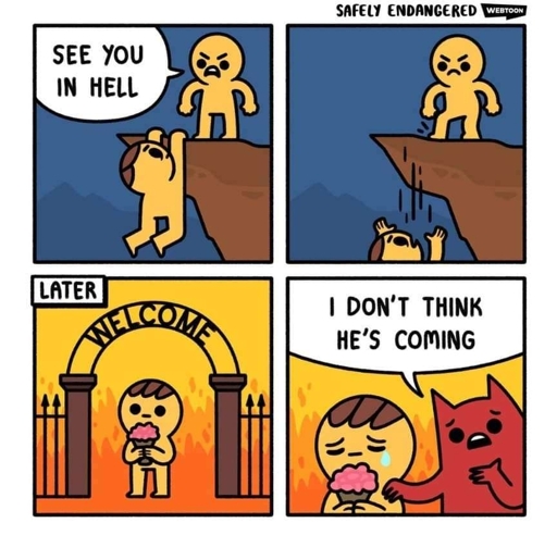 cmoney@lemmy.world to memes@lemmy.world · 3 years agoSee you in hell lemmy.worldimagemessage-square0linkfedilinkarrow-up11