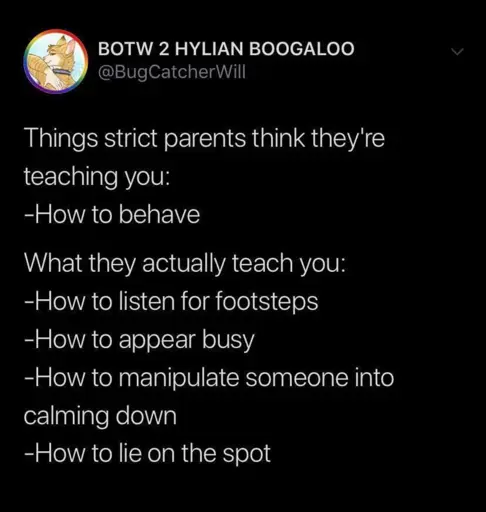 compostgoblin@lemmy.blahaj.zone to memes@lemmy.world · 5 months agoWhat strict parents actually teachlemmy.blahaj.zoneimagemessage-square0linkfedilinkarrow-up11